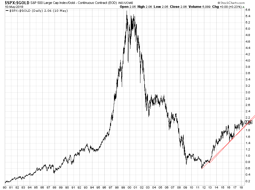 Die bis 2013 abfallende Trendlinie legte nahe, dass Gold in diesem Zeitraum einer Investition in den SPX den Vorzug zu geben war; von 2013 bis heute galt das Gegenteil (steigende Trendlinie). Nach einem (leider nur) kurzen Bruch dieser Trendlinie in 2016 bietet sich jetzt die Chance zu einem nachhaltigen Trendbruch.