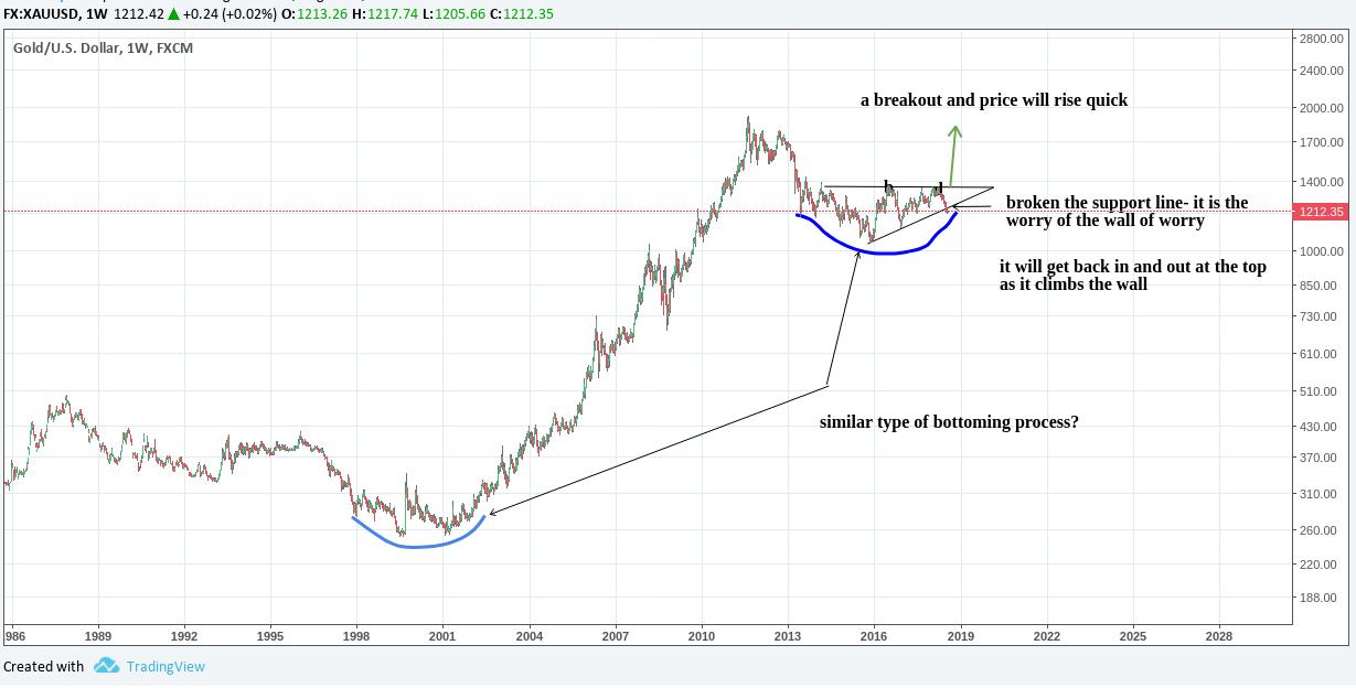 This has many in panic, thinking gold will go lower than the 2016 bottom (the wall of worry). This is typical of major bottoming patterns, especially gold. Price will get back in the triangle and eventually breakout higher.“