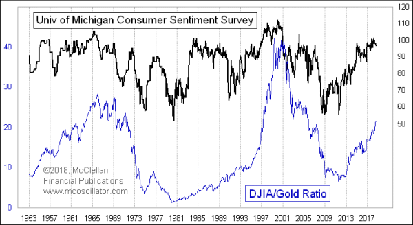 We can see that relationship when we compare this ratio to the University of Michigan’s Consumer Sentiment Survey:Right now that ratio is up near the upper limits of its range, which implies that it is going to be harder for the DJIA/Gold Ratio to continue higher. For that to happen, consumer sentiment would have to continue to improve, and that is going to be hard to do as there is not much room left for improvement. If the consumer starts to lose confidence in the economy, that is going to show up in the University of Michigan data, and presumably also in the preference for stocks versus gold. A drop in confidence will lead people to favor “real” assets over hypothetically valued ones like stocks, and so if one is expecting such a change in confidence then gold would be a preferred asset