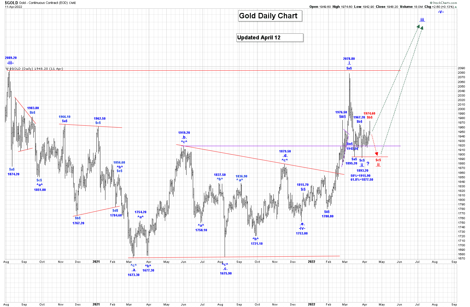 We are now working on the assumption that all of wave .ii. is NOT complete at the 1893.20 low. It looks like within wave .ii., all of wave $a$ ended at 1895.20 and that the current rally is a complex wave $b$, which has the following retracement levels: