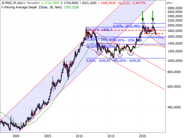 Doppeltopscenario seit Mitte 2020! Ich bleibe dabei, dass sie voraussichtlich früher oder später diese sehr wichtige Unterstützung bei 1.678 USD nach unten reißen dürften. Abwärtskorrektur in Richtung 1.550 USD möglich. S. Prognosepfeile. Zunächst kann es aber erneut einen Abpraller nach oben geben. Das sollte einkalkuliert werden.