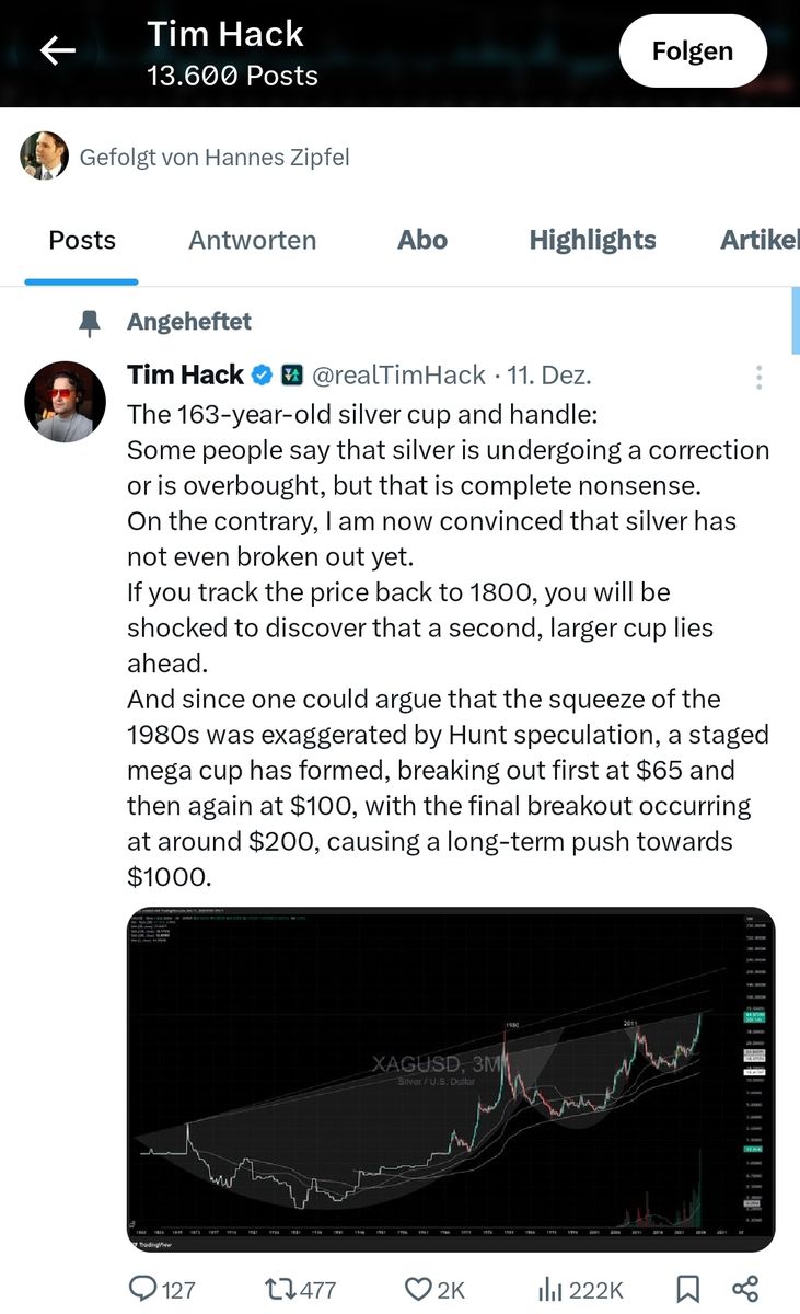 Man weiss ja, dass New York den Preis drückt und Asien dann kauft. Aber wann geht ein Bullenmarkt zu Ende? Offensichtlich sind wir in einem Bullenmarkt. Kritisch wird es, wenn rot (aktueller Preis) auf blau trifft. Blau ist aktuell bei 400...... auch wenn der overnight Preis einbricht, dürften die Amis den Silberpreis noch gut in den dreistelligen Bereich hochtreiben. Und wenn Asien nicht einbricht, dann sind 500 oder noch mehr sogar ein Thema..