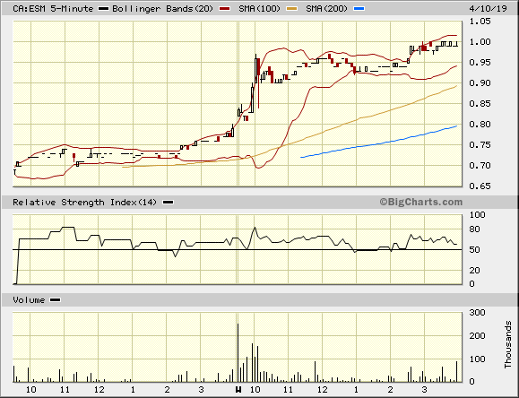 Die Kursentwicklung bei ESM wird immer merkwürdiger. Gestern mit weiterem starken Kursanstieg + 25,3 % auf 0,99 C$. Schon der Anstieg zuvor war aussergewöhnlich.