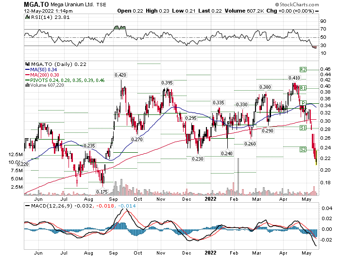 Mega Uranium, stets im Schatten der bekannteren großen Uranier, gestern mit + 9,2 % = 0,41 C$ = 8 JH SK.
