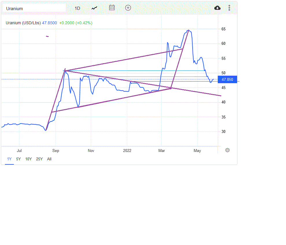 Ich denke, wir haben das Gröbste hinter uns. Hab mal paar Linien ins Uran gekritzelt, jedenfalls haben sie die erste Flagge abgefrühstückt mMn., und dann jedes kleine Top im Abwärtsgang getestet (dünne Linien). Damit hat Uran also den roten Retest vom Ausbruch des Wimpels bei 47,6 hinter sich. Nun dürfte es steigen können...und wenn Uran steigt, steigen auch die Minen und Royals...