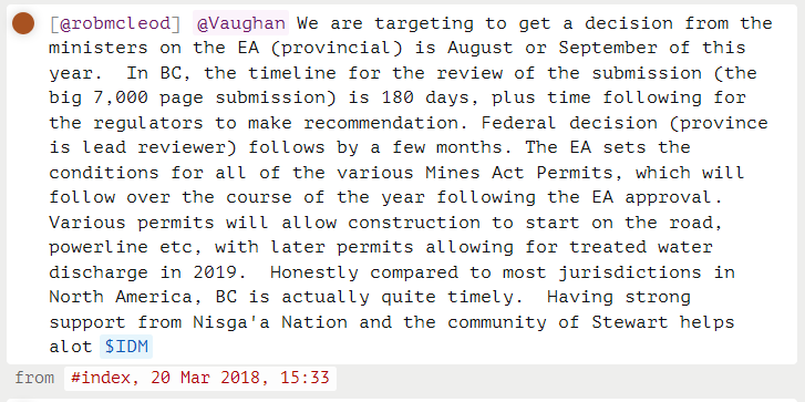 - Permitting: Project Application/EIS currently under review. Environmental Assessment Certificate (EAC)Expected to be issued in mid-2018; Operating permits in H2 2018.