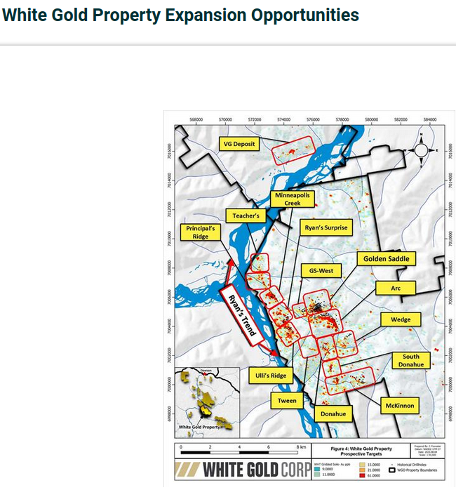 Die aktualisierte MRE zeigt einen deutlichen Anstieg der Gesamtgoldmenge, darunter einen Anstieg der angezeigten Ressourcen um 44 % (529.300 Unzen) auf insgesamt 1.732.300 Unzen Gold und einen Anstieg der abgeleiteten Ressourcen um 13,4 % (149.300 Unzen) auf insgesamt 1.265.900 Unzen Gold(1). Die Goldressourcen im White Gold-Projekt liegen nahe der Oberfläche, sind fast vollständig in Tagebaugruben erfasst und können in mehrere Richtungen erweitert werden, wobei zusätzliche Explorationsmöglichkeiten bestehen, um die Gesamtressourcen durch Ziele in unmittelbarer Nähe zu erhöhen (Abbildung 4). Das laufende Explorationsprogramm 2025 (Abbildung 5 und 6) wurde konzipiert, um weitere Steigerungen zu erzielen....