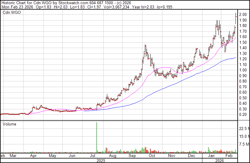 Die Entwicklung von WGO erfolgt nun stürmischer, Kurs gestern auf 1,57 C$ + 9,8 % = 7 JH.