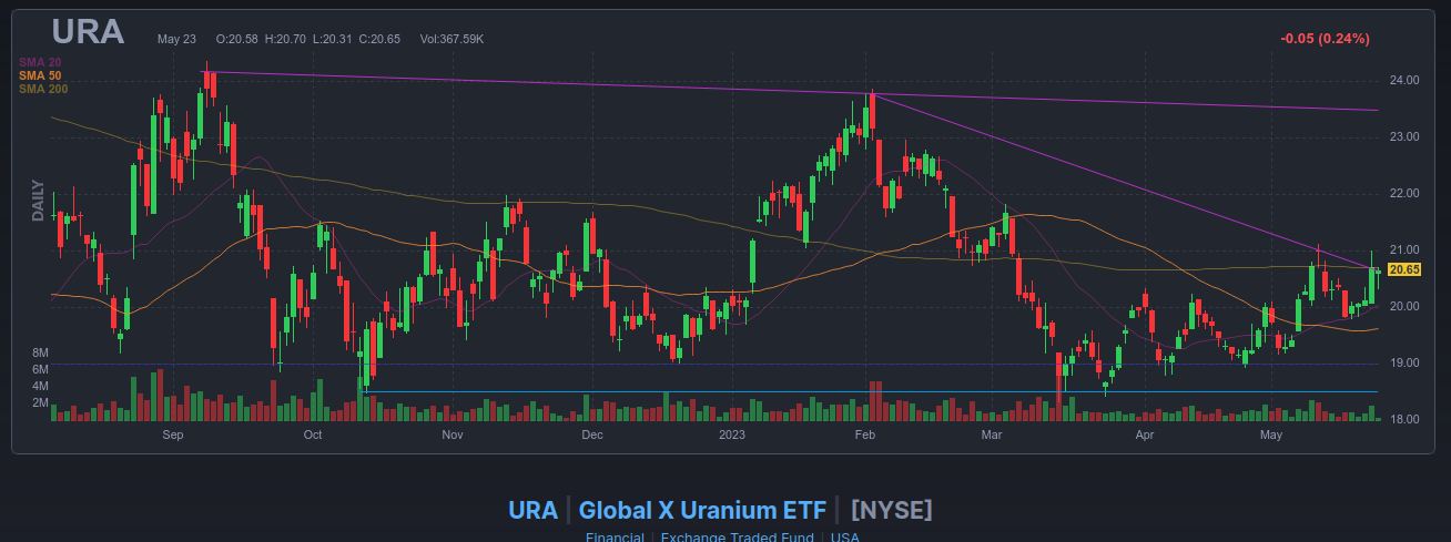 Der URA seit Tagen freundlich, sh.Chart, auch mit steigendem Trend. Die stark abgestrafte UEC hat es dann auch positiv erwischt.