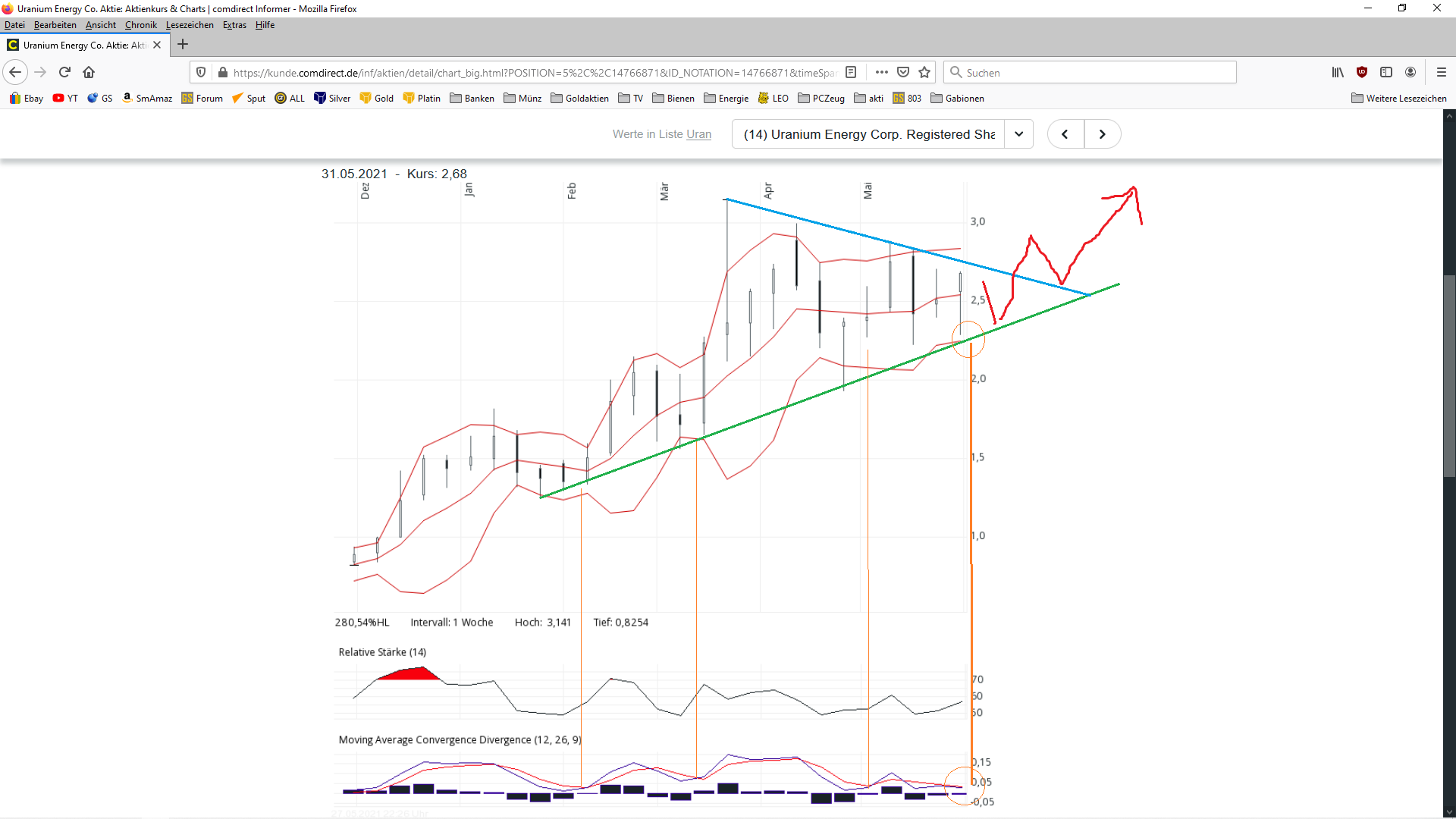 Theoretisches Kursziel = 5,4 $. Bestand wurde nach der Konsolidierung wieder hergestellt, UEC = Uran Nr.1 im Depot.