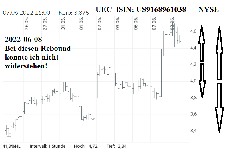 Ich vermute, dass smarte Investoren den hohen Umsatz genutzt haben und ein hoher Anteil der Shares jetzt in festen Händen ruht, die auf das Kommende warten. Die Marktkap. mit knapp 1,3 Mrd. $ überfordert diese Kreise nicht. Vermutlich gibt es größere Stückzahlen an UEC nur zu steigenden Kursen. Und die Trader schauen irgendwann dem Zug hinterher.