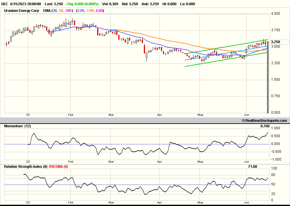 Der URA seit Tagen freundlich, sh.Chart, auch mit steigendem Trend. Die stark abgestrafte UEC hat es dann auch positiv erwischt.Grüsse