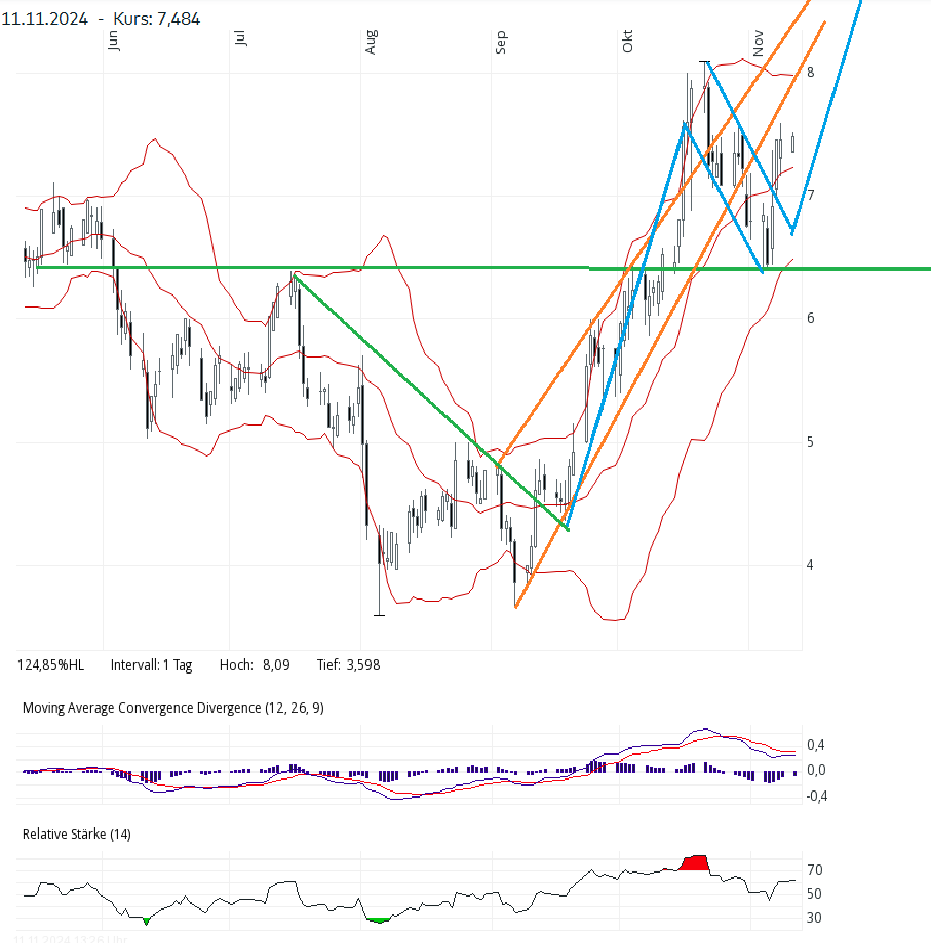Ab hier wäre für mich das Ziel um 10-11 Euro (blau rechts)