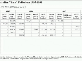 Es wurden in diesem Jahr zweimal "kleine" Kontigente des 98er Emu weitergeprägt, um am Markt zu sondieren, wie diese Münzen aufgenommen werden und wie teuer die Herstellungskosten zu Buche schlagen. Das Ergebnis: Palladiummünzen zu produzieren ist der PM zu teuer und der Absatz zu schwach. Demnach sollen zukünftig keine weiteren Pd-Münzen geprägt bzw. weitergeprägt werden.