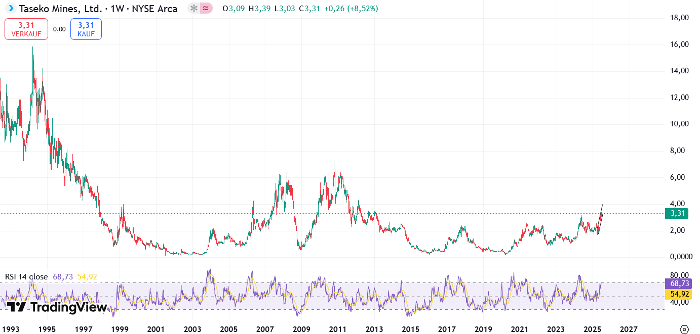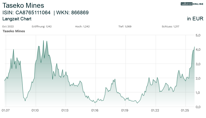 Der mittelfristige Chart zeigt jedoch, daß Taseko ähnlich den Peers schon weitaus höhere Vola zeigte.