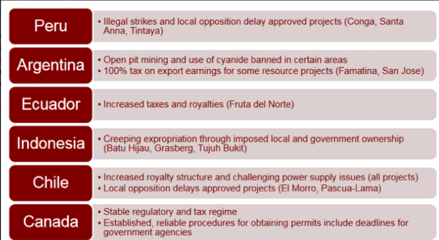 Die Vorkommen sind hauptsächlich in Equador (in o.g. prozentualer Aufteilung in Gold, Silber u. Kupfer) und ein kleiner Explorationsanteil in Namibia. (Silber u. Kupfer)