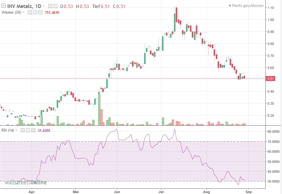 Nachdem INV im Juli bei etwa 1,1 CAD ein markantes Hoch durchlaufen hat, folgte darauf - praktisch unabhängig von der POG-Entwicklung - ein stetiger Abwärtstrend: