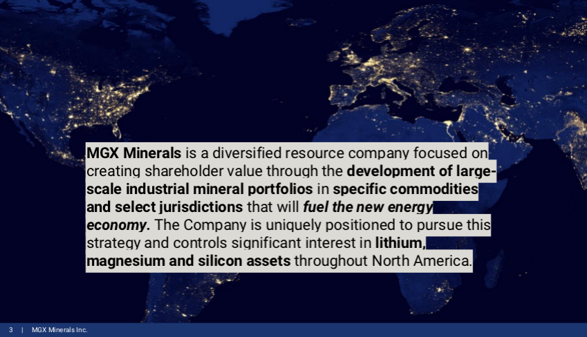 "MGX Minerals is a developer of lithium, magnesium and silicon projects using innovative processes to supply the new energy economy."