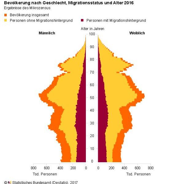 Kehren wieder zum abgebildeten Diagramm zurück, das die Ergebnisse des Mikrozensus‘ für das Jahr 2016 darstellt. Man achte auf die Feinheiten. Darin werden Deutsche nun mehr als „Personen ohne Migrationshintergrund“ bezeichnet und stehen gleichauf neben „Personen mit Migrationshintergrund“. Damit sind sie sprachformell gleichrangig mit den Migrantenbestandteilen der Bevölkerung. Umgangssprachlich verfestigt sich diese Gleichstellung seit einiger Zeit mit den Begriffen „Neu-Hinzugekommene“ und „Die schon länger hier sind“. Das betont ebenso die Gleichwertigkeit. Bis vor kurzem hätte die Beschriftung des Diagramms vom Statistischen Bundesamt gelautet: „Deutsche“, „Ausländer“ und „gesamt“.