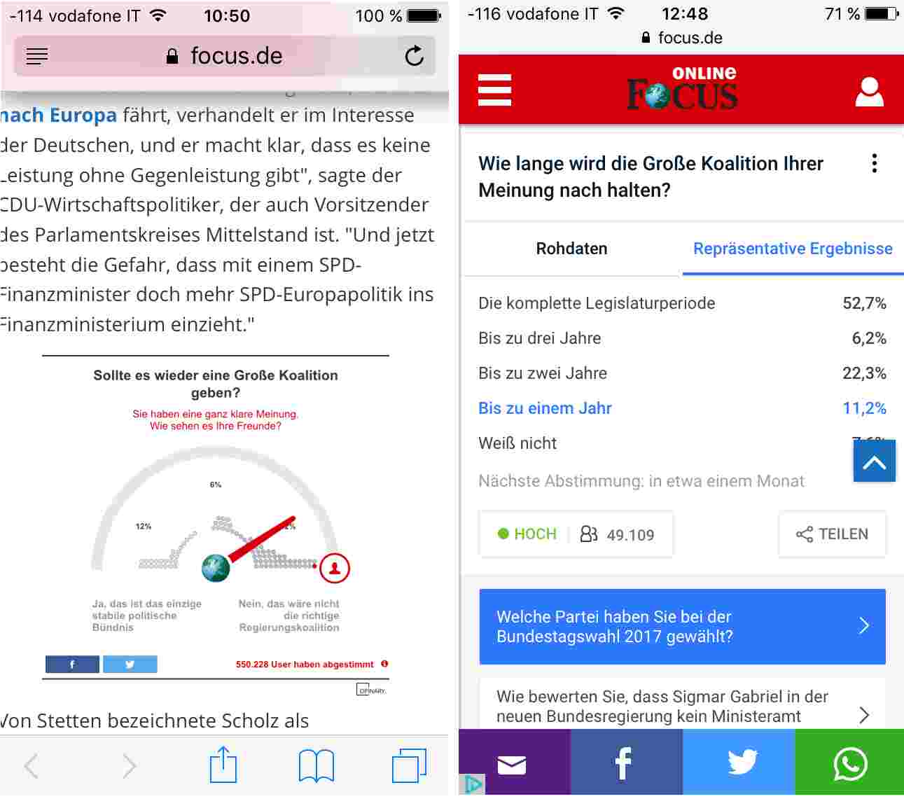 Während die GROKO Teilnehmer sich ächzend ihrer staatstragenden Verantwortung stellen, hat FOCUS mit über 500.000 Teilnehmern eine Umfrage zur GROKO gemacht, die erwartungsgemäß mit über 83% ein lautes NEIN geschrien haben... (linkes Bild)