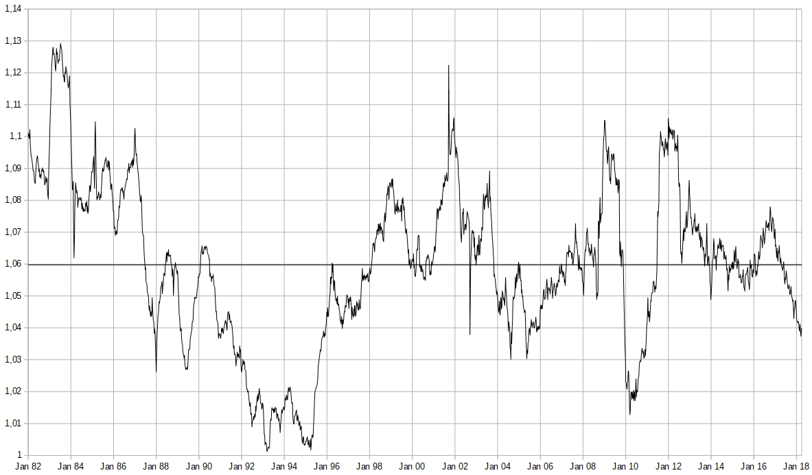 Interessant ist, dass die Crashs 1988 und 2009 gut den Tiefpunkt markieren (0,8).