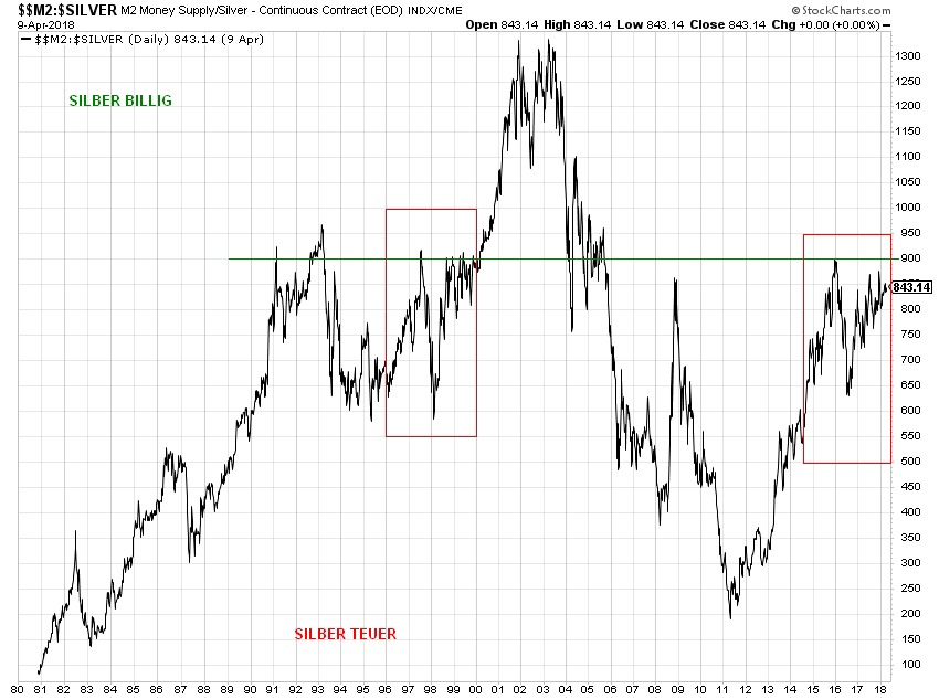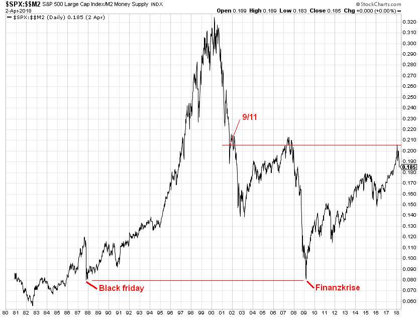 Jetzt kann man z.B. S&P 500 durch M2 teilen, um unteres Bild zu erhalten.