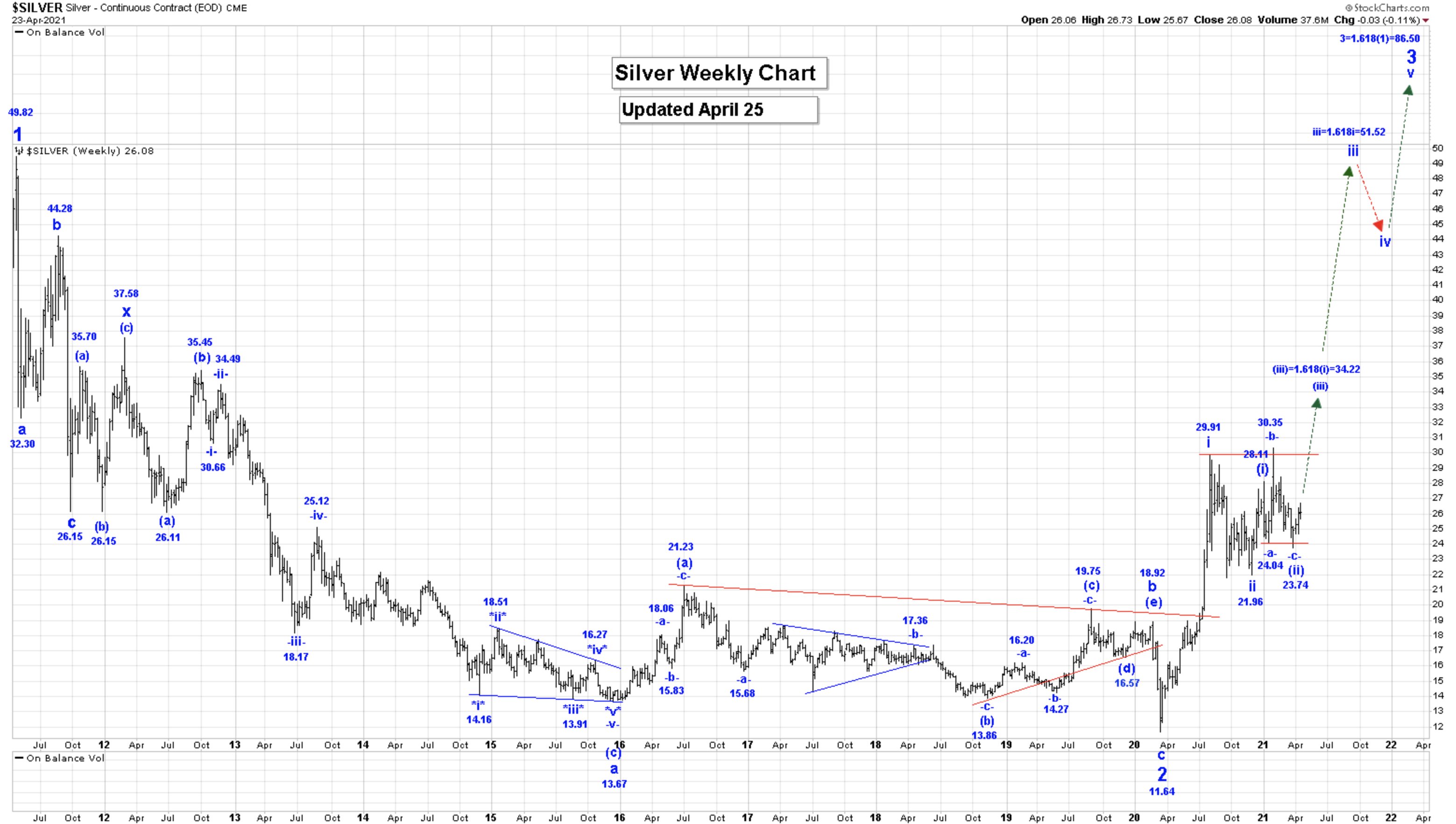 Note the potential head and shoulders bottom formation on our Daily Gold Chart.Longer term our first projection for the end of wave ^iii^ is: