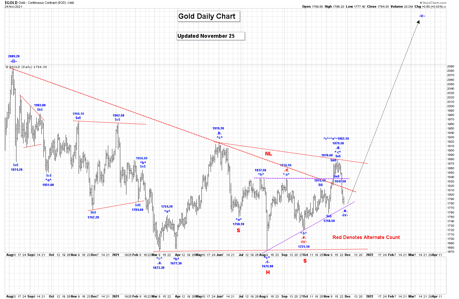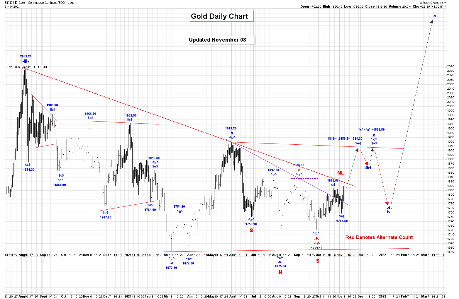 If that is the case then we are now rallying in wave *d*. Wave *d*, looks to be turning into a 3 wave pattern as shown on our Daily Gold Chart, with all wave $b$ perhaps ending at the 1745.40 low.