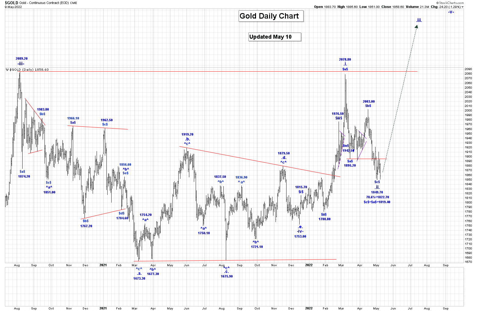 We continue our long correction in our wave -iv- bullish triangle as shown on our Daily Gold Chart. Wave .d. ended at 1879.50.