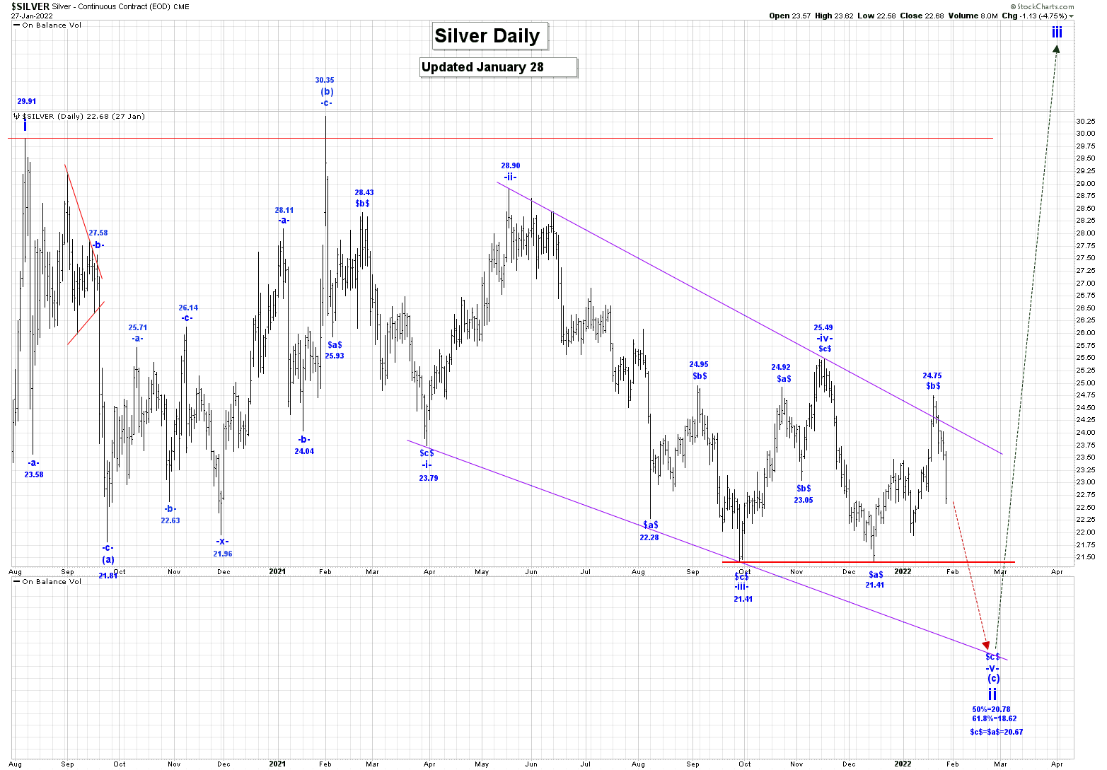 We expect lower prices in silver until we reach at least the 21.41 low.