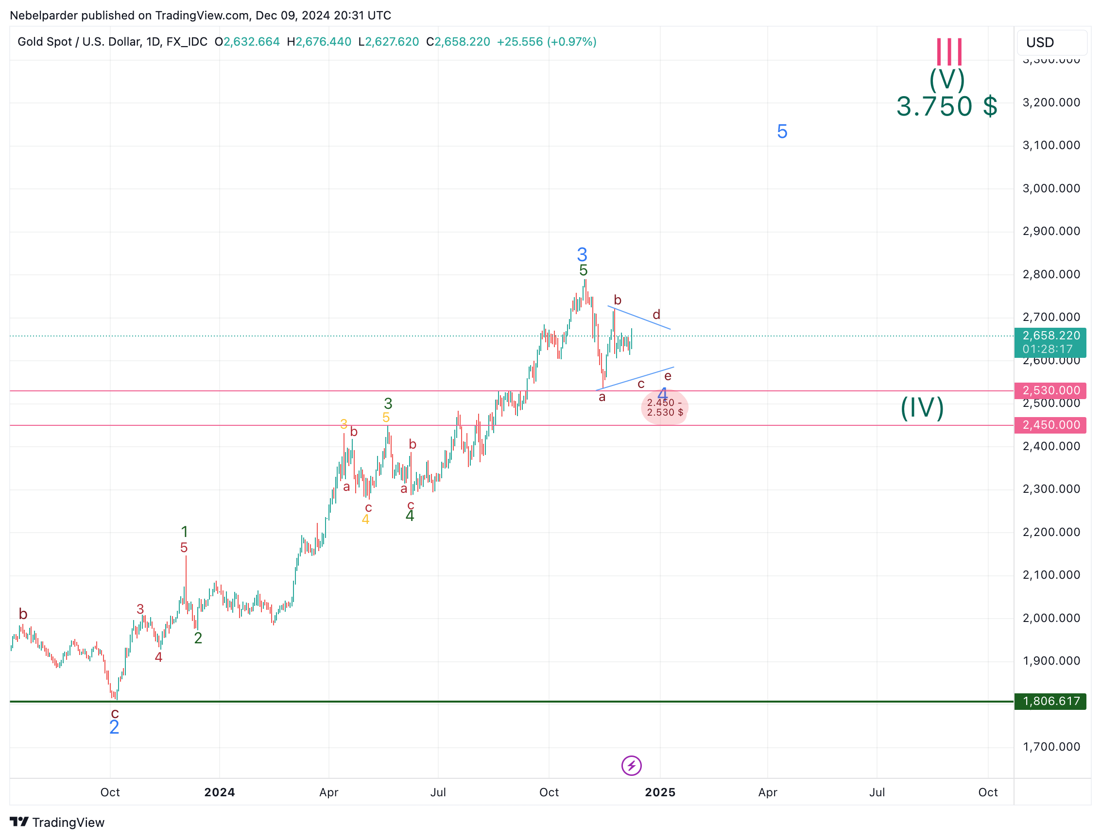 Danach noch die D bis ca. 2.685 $ und die abschließende E bis vielleicht ca. 2.589 $ oder auch höher, da die letzte Welle in einem Dreieck manchmal nur den halben Weg schafft.