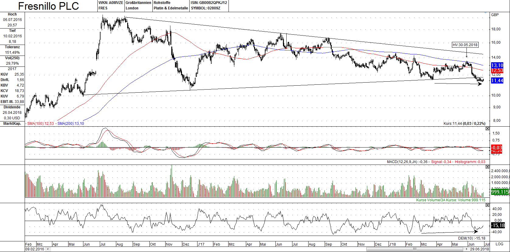 FRES zahlt zudem eine satte Dividende von ca. 2,5 %. Ich würde FRES vom Potenzial her in etwa mit einem soliden, dividendenstarken DAX-Wert vergleichen, den man 2009 im Tief gekauft hätte. Nur wird es bei FRES mit der Verdopplung nicht bis 2017/18 dauern, also fast 9 Jahre, sondern evtl. vielleicht nur ein paar Monate oder 1-2 Jahre. (gilt natürlich nur, wenn die Gold- u. Silberpreise die genannten Ziele erreichen werden)