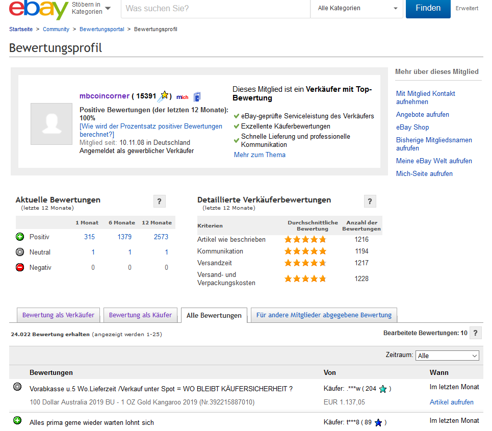 • Es gibt sehrwohl Negativ-Bewertungen FÜR MB-COINCORNER...gleich auf der ersten Seite in den letzten Tagen...