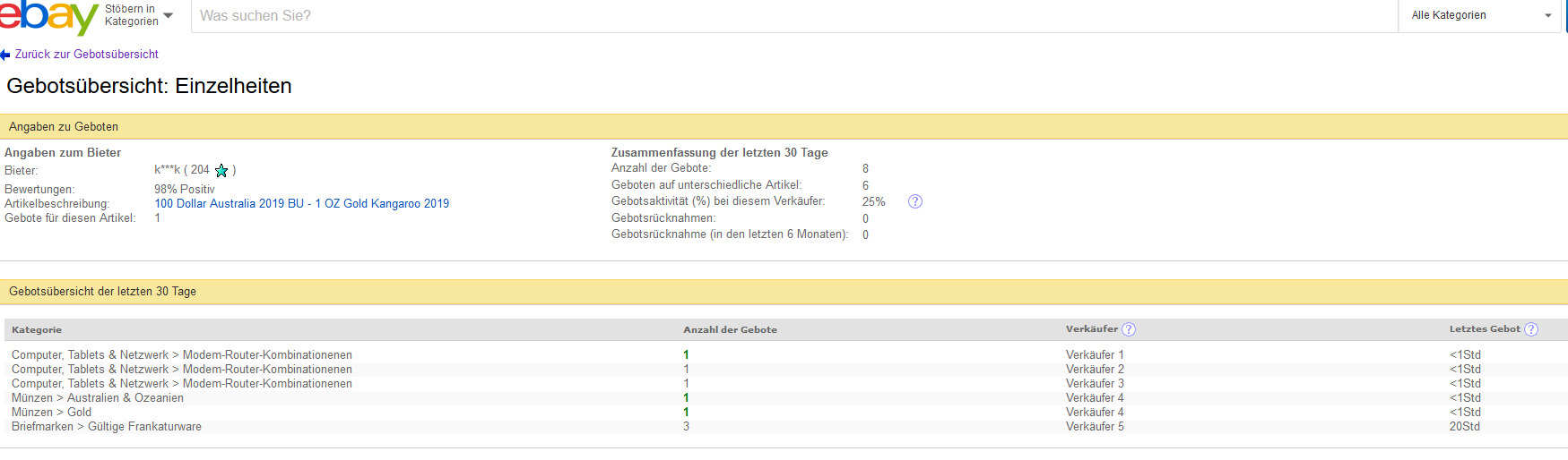 • Gestern liefen für über 40.000 Euro Goldunzen bei Ebay aus, die allesamt - spätestens unter Ebay-Gebührenberücksichtigung - unter Wiederbeschaffungskosten ausliefen. Auch allesamt - spätestens nach Gebührenberücksichtigung - unter dem Ankaufspreis z.B. der Exchange Goldankaufsgruppe.