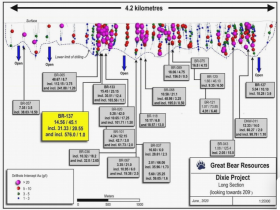 Chris Taylor, President und CEO von Great Bear, sagte: "Bohrloch BR-137 durchteufte bisher den hochgradigsten und breitesten Goldabschnitt in der LP-Verwerfung. Es wurde in einem 90 Meter langen, zuvor nicht gebohrten Abschnitt der LP-Verwerfung abgeschlossen. Die Ergebnisse beinhalten bis zu 18,5 Unzen pro Tonne (576 g/t) Gold über einen Meter, innerhalb eines breiteren Abschnitts von etwa einer Unze pro Tonne (31,33 g/t) Gold über 20,55 Meter. Noch wichtiger ist, dass alle angrenzenden Bohrlöcher, sowohl vertikal auf demselben Abschnitt als auch seitlich entlang des Streichens, ebenfalls über beträchtliche Breiten stark mineralisiert sind, was auf eine ausgezeichnete Kontinuität der hochgradigen Goldmineralisierung schließen lässt".