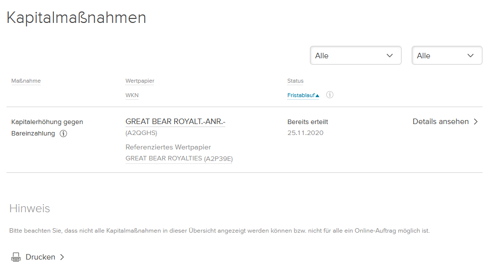 Heute habe auch nun endlich von meinem Institut die Unterlagen "Kapitalerhöhung gegen Bareinzahlung mit Überbezug" zu GREAT BEAR ROYALTIES erhalten.