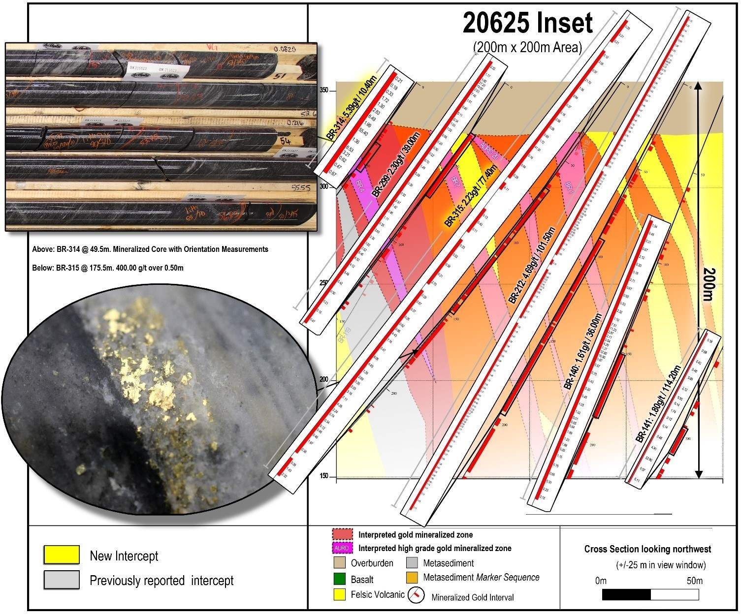 Das neue Bohrloch BR-315 wurde innerhalb einer zuvor nicht bebohrten Lücke von 100 Metern im Abschnitt 20625 fertiggestellt und durchschnitt erfolgreich die drei hochgradigen Domänen BR7, AURO20 und BR1, die in den Pressemitteilungen vom 19. Mai und 3. Juni 2021 beschrieben wurden. Es wurde auch eine vierte, kürzlich definierte hochgradige Golddomäne, BR4, südwestlich der anderen hochgradigen Domänen durchschnitten. BR-315 durchschnitt auch eine Goldmineralisierung mit großen Tonnagen zwischen den hochgradigen Domänen. Die Highlights der Ergebnisse beinhalten: