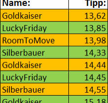 • Es können nur exakte Tipps gewertet werden. Variable Angaben wie beispielsweise "bei Doppeltipp 1 Cent höher" können nicht berücksichtigt werden.