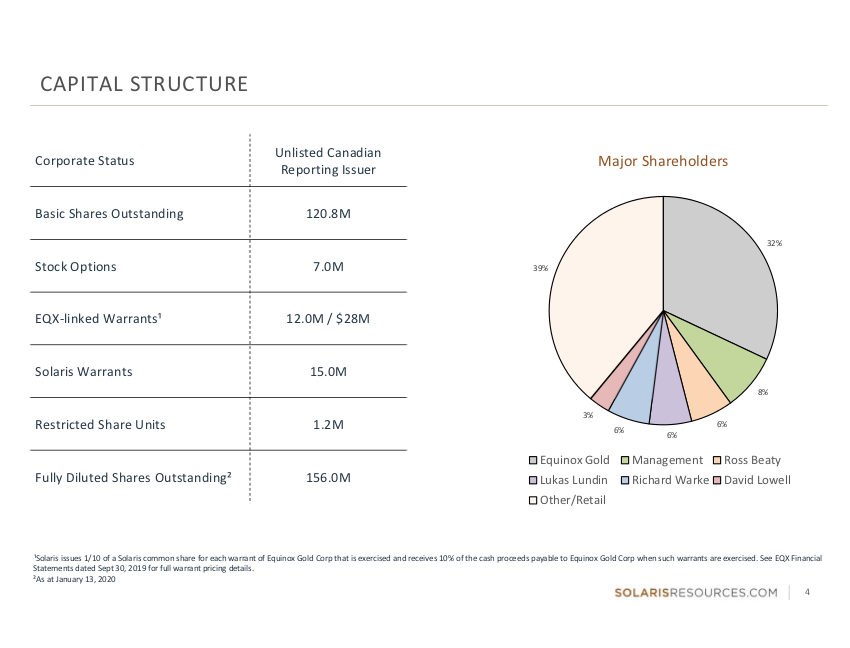 Solaris enstand im August 2018 als ein Spin-Out der Kupferprojekte von Equinox Gold. EQX behielt 40 %, 60 % wurden auf die Aktionäre ausgegeben im Verhältnis 1:10 je EQX Aktie.