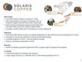 Solaris enstand im August 2018 als ein Spin-Out der Kupferprojekte von Equinox Gold. EQX behielt 40 %, 60 % wurden auf die Aktionäre ausgegeben im Verhältnis 1:10 je EQX Aktie.