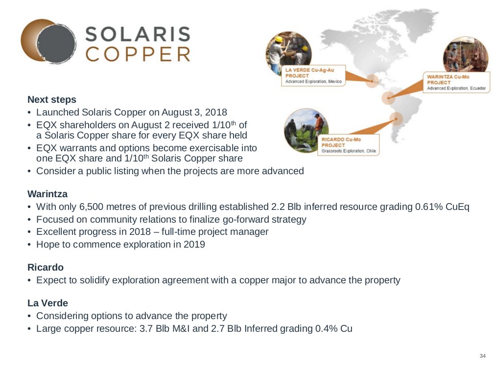 Solaris enstand im August 2018 als ein Spin-Out der Kupferprojekte von Equinox Gold. EQX behielt 40 %, 60 % wurden auf die Aktionäre ausgegeben im Verhältnis 1:10 je EQX Aktie.