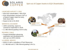 Solaris enstand im August 2018 als ein Spin-Out der Kupferprojekte von Equinox Gold. EQX behielt 40 %, 60 % wurden auf die Aktionäre ausgegeben im Verhältnis 1:10 je EQX Aktie.