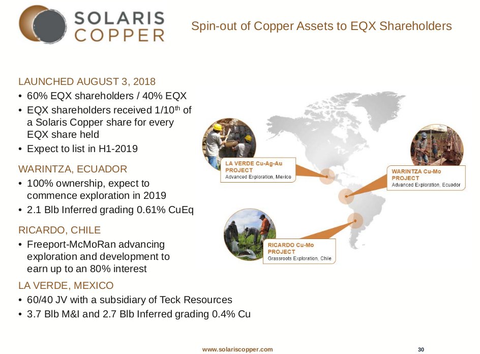 Solaris enstand im August 2018 als ein Spin-Out der Kupferprojekte von Equinox Gold. EQX behielt 40 %, 60 % wurden auf die Aktionäre ausgegeben im Verhältnis 1:10 je EQX Aktie.