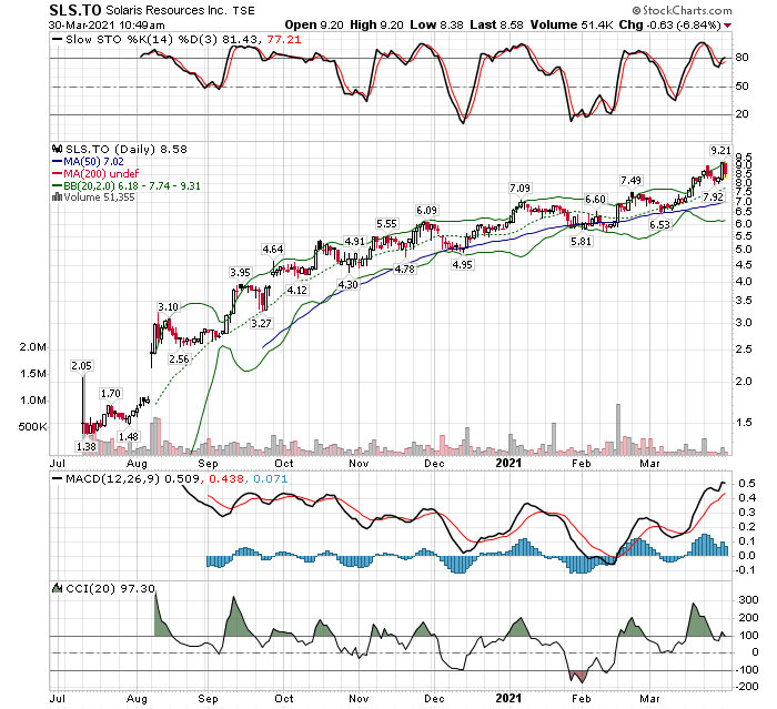 Solaris exploriert nahezu unbeachtet eindrucksvoll... Der Kurs pendelt auf hohem Niveau seit Monaten zw. 12 und 15 C$. SLS liegt mittelschwergwichtig im Depot als Kupferoption.