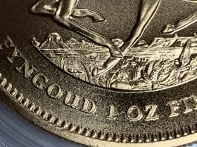 Sieht insgesamt gut aus - halt für mein Gefühl etwas zu "goldig". Der Schriftzug KRUGERRAND unterhalb der Berge links des Springbocks ist auch erkennbar.