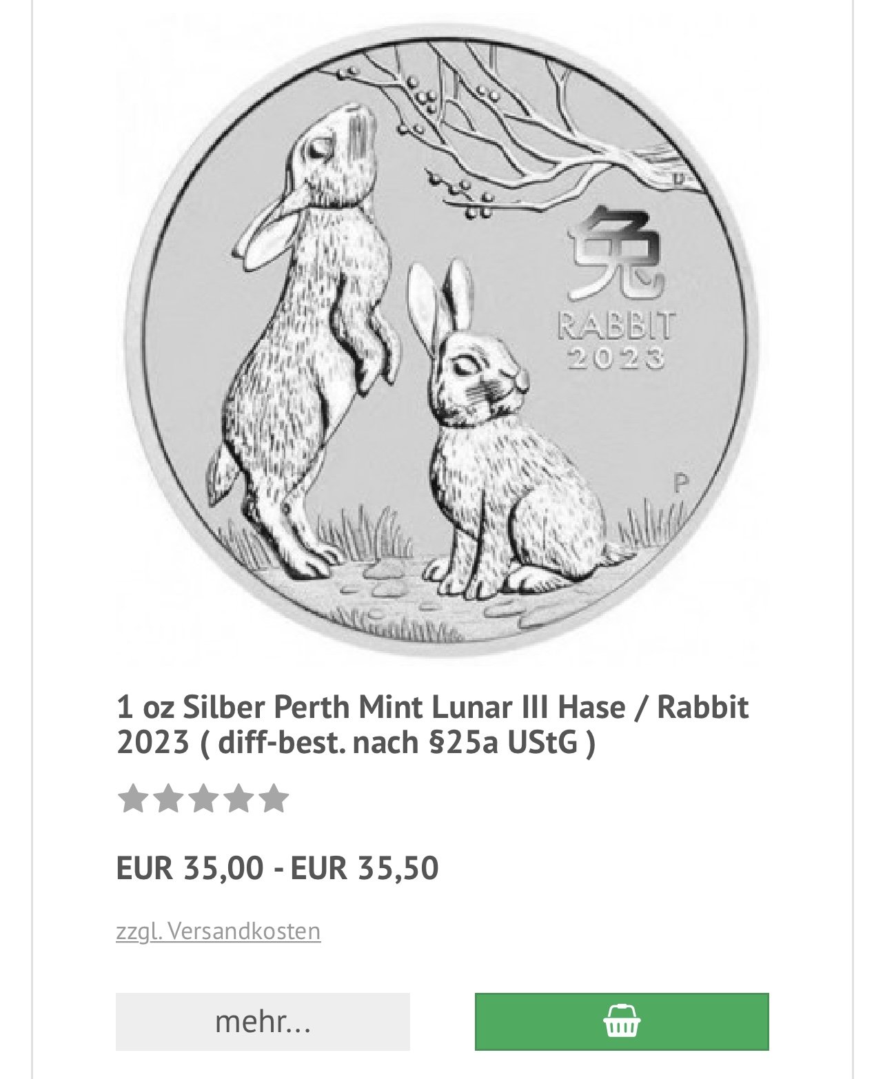 • Aktuell gibt es den Lunar III 1oz Silberhasen ab rd. 30,40 Euro. Zeitweise (vor wenigen Tagen) lag der Preis auch einen Schnaps unter der 30 Euro Marke. Liegt nicht nur am Rückwärtsgang des POS, sondern vielmehr am abschmelzenden Aufgeld der Händler (was immer noch mit rd 50 % sehr hoch ist).