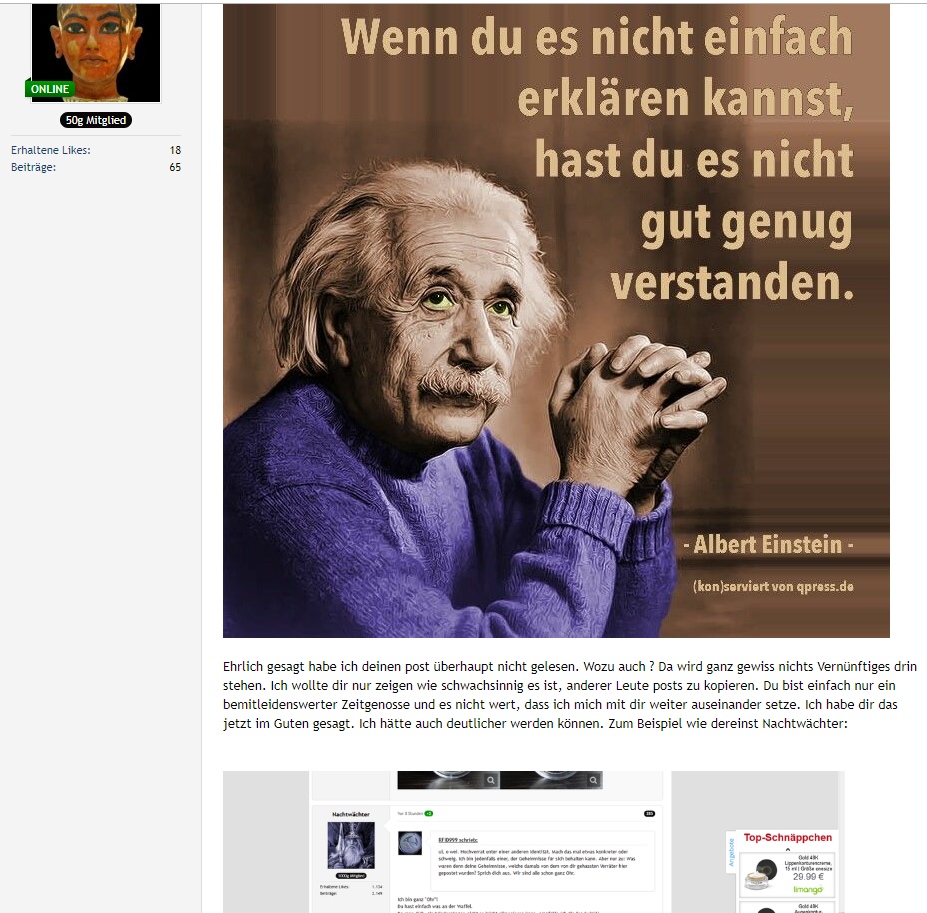 Jetzt kommt die Trotz- und Löschphase, schade ... Deine Münzbilder waren sehr schön, hat keiner bestritten ... Warum bestrafst du "unschuldigen" und externen Leser?