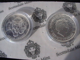 1 Unze Silber Erstausgabe African Leopard 2017 Republic of Ghana 100 Cedis Fehlprägung Auflage: 5.000 Stücke 1 Unze Silber Erstausgabe African Leopard 2017 Republic of Ghana 5 Cedis - Auflage: 50.000 Stücke 1 Unze Silber African Leopard 2018 Republic of Ghana 5 Cedis Auflage: 8.500 Stücke