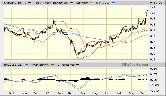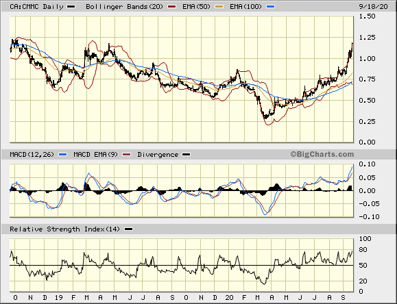 CMMC trotzt allen Theorien und Meinungen ... und steigt vehement weiter, gestern auf 1,18 C$ + 9,2 % = 2 JH.