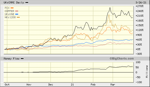 Angehängt ein Kursvergleich zu Copper, den Kupferriesen FCX und KAZ sowie der Neuerwerbung MMG.